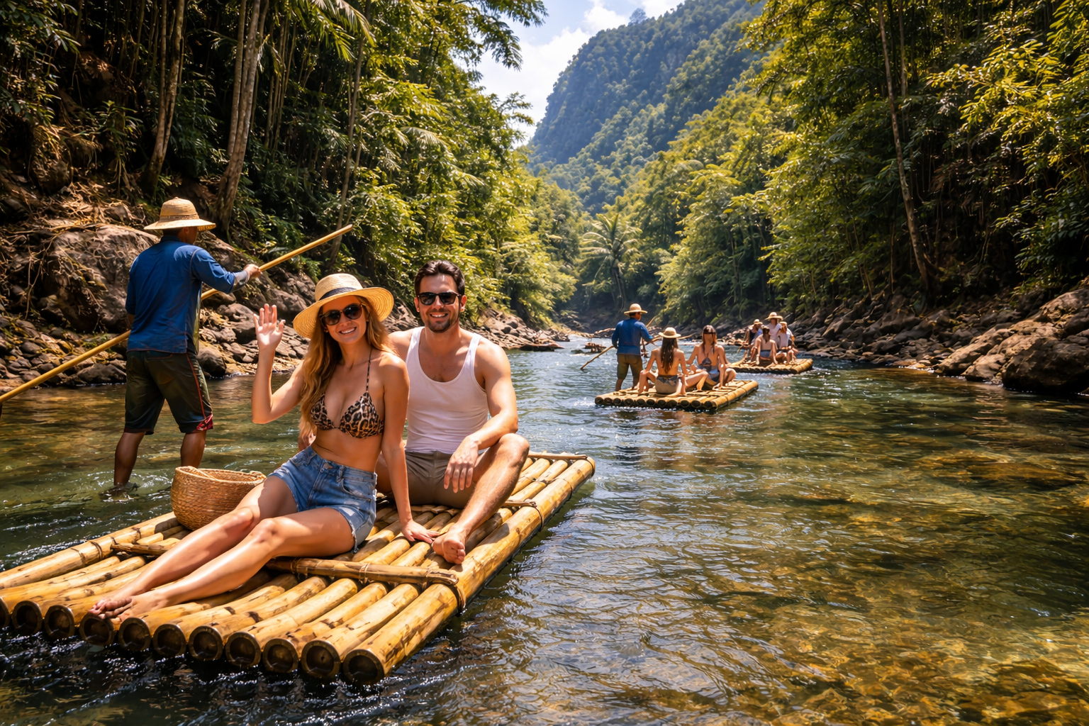 • 01:30 PM: Bamboo Rafting & Nature Exploration Switch to a traditional bamboo raft for a peaceful and relaxing float down the river, surrounded by lush tropical greenery.